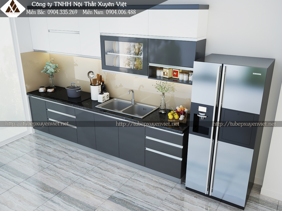 – Toàn bộ tủ bếp chất liệu bằng nhựa PVC cao cấp, bề mặt phủ acrylic bóng gương 2 màu ghi xám và trắng, bàn đá đen kim sa và kính ốp bếp nâu vàng hiện đại.