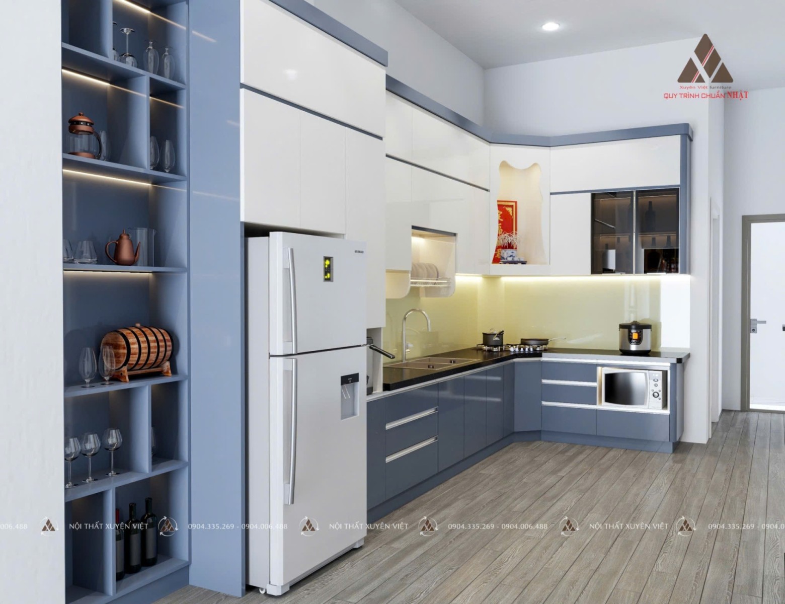 Xanh Navy (Xanh Hải Quân): Mạnh mẽ, cá tính và không kém phần sang trọng. Tủ bếp màu xanh navy tạo chiều sâu cho không gian, đặc biệt hiệu quả khi kết hợp với màu trắng, vàng đồng hoặc gỗ sồi. Đây là lựa chọn tuyệt vời cho những ai muốn một căn bếp có điểm nhấn táo bạo nhưng vẫn giữ được sự tinh tế.